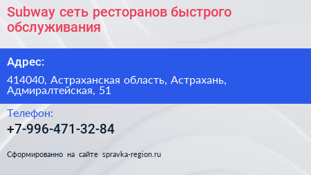 Subway, сеть ресторанов быстрого обслуживания по адресу 414040, Астраханская область, Астрахань, Адмиралтейская, 51 в дальнейшем Организация, размещена в следующих категориях: