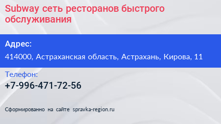 Subway, сеть ресторанов быстрого обслуживания по адресу 414000, Астраханская область, Астрахань, Кирова, 11 в дальнейшем Организация, размещена в следующих категориях: