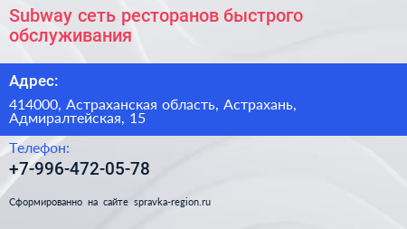 Subway, сеть ресторанов быстрого обслуживания по адресу 414000, Астраханская область, Астрахань, Адмиралтейская, 15 в дальнейшем Организация, размещена в следующих категориях: