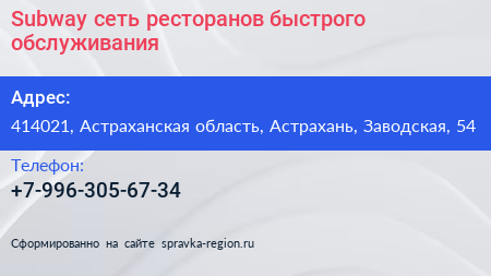 Subway, сеть ресторанов быстрого обслуживания по адресу 414021, Астраханская область, Астрахань, Заводская, 54 в дальнейшем Организация, размещена в следующих категориях: