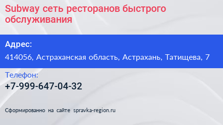 Subway, сеть ресторанов быстрого обслуживания по адресу 414056, Астраханская область, Астрахань, Татищева, 7 в дальнейшем Организация, размещена в следующих категориях: