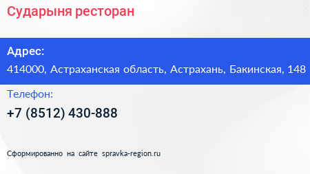Сударыня, ресторан по адресу 414000, Астраханская область, Астрахань, Бакинская, 148 в дальнейшем Организация, размещена в следующих категориях: