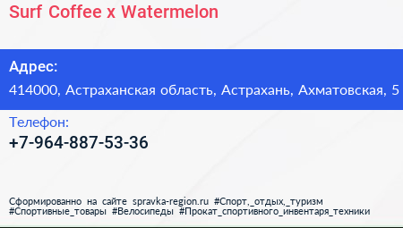 Surf Coffee x Watermelon по адресу 414000, Астраханская область, Астрахань, Ахматовская, 5 в дальнейшем Организация, размещена в следующих категориях: