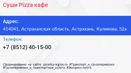 Суши-Pizza, кафе по адресу 414041, Астраханская область, Астрахань, Куликова, 52а в дальнейшем Организация, размещена в следующих категориях: