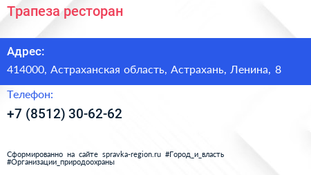 Трапеза, ресторан по адресу 414000, Астраханская область, Астрахань, Ленина, 8 в дальнейшем Организация, размещена в следующих категориях: