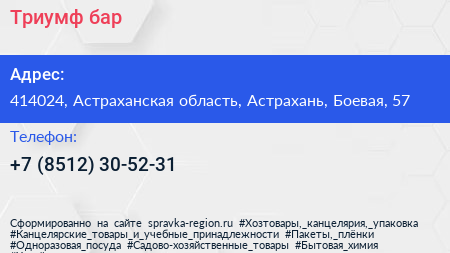 Триумф, бар по адресу 414024, Астраханская область, Астрахань, Боевая, 57 в дальнейшем Организация, размещена в следующих категориях: