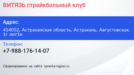 ВИТЯЗЬ, страйкбольный клуб по адресу 414052, Астраханская область, Астрахань, Августовская, 1г лит1и в дальнейшем Организация, размещена в следующих категориях: