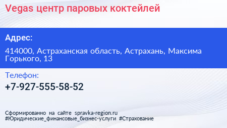 Vegas, центр паровых коктейлей по адресу 414000, Астраханская область, Астрахань, Максима Горького, 13 в дальнейшем Организация, размещена в следующих категориях: