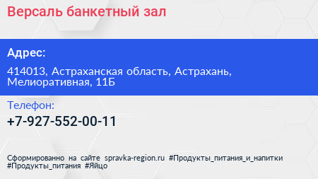 Версаль, банкетный зал по адресу 414013, Астраханская область, Астрахань, Мелиоративная, 11Б в дальнейшем Организация, размещена в следующих категориях: