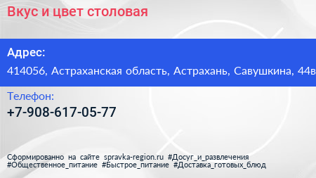 Вкус и цвет, столовая по адресу 414056, Астраханская область, Астрахань, Савушкина, 44в в дальнейшем Организация, размещена в следующих категориях: