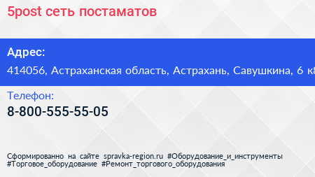 5post, сеть постаматов по адресу 414056, Астраханская область, Астрахань, Савушкина, 6 к8 в дальнейшем Организация, размещена в следующих категориях: