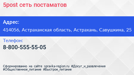 5post, сеть постаматов по адресу 414056, Астраханская область, Астрахань, Савушкина, 25 в дальнейшем Организация, размещена в следующих категориях: