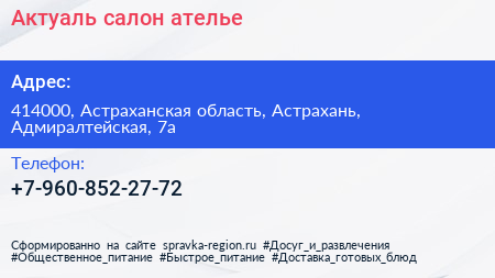 Актуаль, салон-ателье по адресу 414000, Астраханская область, Астрахань, Адмиралтейская, 7а в дальнейшем Организация, размещена в следующих категориях: