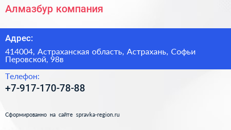 Алмазбур, компания по адресу 414004, Астраханская область, Астрахань, Софьи Перовской, 98в в дальнейшем Организация, размещена в следующих категориях: