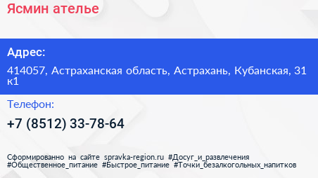 Ясмин, ателье по адресу 414057, Астраханская область, Астрахань, Кубанская, 31 к1 в дальнейшем Организация, размещена в следующих категориях: