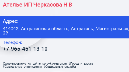 Ателье, ИП Черкасова Н.В. по адресу 414042, Астраханская область, Астрахань, Магистральная, 29 в дальнейшем Организация, размещена в следующих категориях: