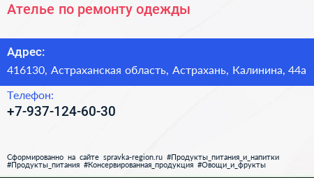 Ателье по ремонту одежды по адресу 416130, Астраханская область, Астрахань, Калинина, 44а в дальнейшем Организация, размещена в следующих категориях: