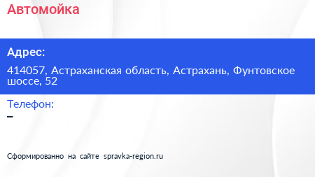 Автомойка по адресу 414057, Астраханская область, Астрахань, Фунтовское шоссе, 52 в дальнейшем Организация, размещена в следующих категориях: