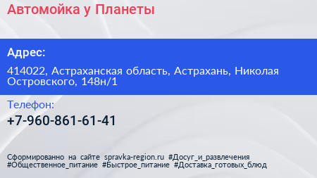 Автомойка у Планеты по адресу 414022, Астраханская область, Астрахань, Николая Островского, 148н/1 в дальнейшем Организация, размещена в следующих категориях: