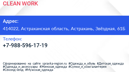 CLEAN WORK по адресу 414022, Астраханская область, Астрахань, Звёздная, 61Б в дальнейшем Организация, размещена в следующих категориях: