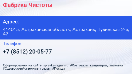 Фабрика Чистоты по адресу 414015, Астраханская область, Астрахань, Тувинская 2-я, 47 в дальнейшем Организация, размещена в следующих категориях: