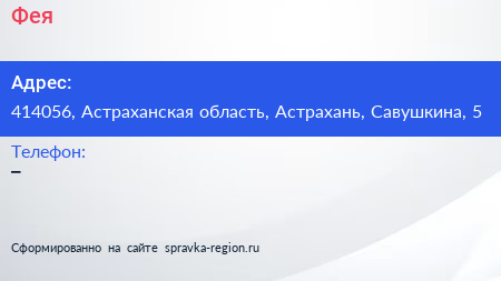 Фея по адресу 414056, Астраханская область, Астрахань, Савушкина, 5 в дальнейшем Организация, размещена в следующих категориях: