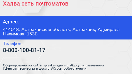Халва, сеть почтоматов по адресу 414018, Астраханская область, Астрахань, Адмирала Нахимова, 153Б в дальнейшем Организация, размещена в следующих категориях: