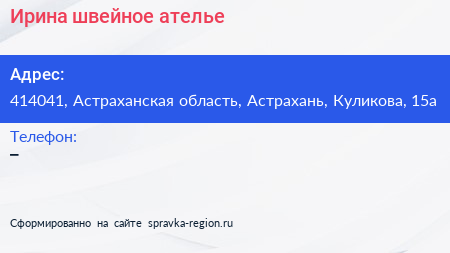 Ирина, швейное ателье по адресу 414041, Астраханская область, Астрахань, Куликова, 15а в дальнейшем Организация, размещена в следующих категориях:
