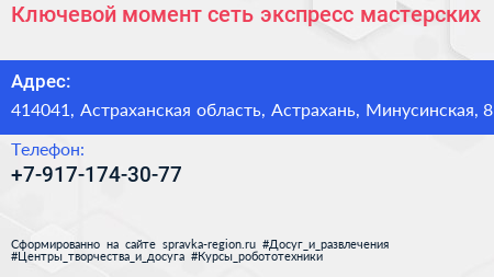 Ключевой момент, сеть экспресс-мастерских по адресу 414041, Астраханская область, Астрахань, Минусинская, 8 в дальнейшем Организация, размещена в следующих категориях: