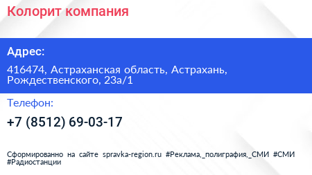 Колорит, компания по адресу 416474, Астраханская область, Астрахань, Рождественского, 23а/1 в дальнейшем Организация, размещена в следующих категориях:
