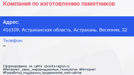 Компания по изготовлению памятников по адресу 416109, Астраханская область, Астрахань, Весенняя, 32 в дальнейшем Организация, размещена в следующих категориях: