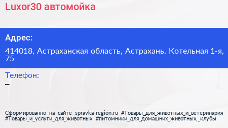 Luxor30, автомойка по адресу 414018, Астраханская область, Астрахань, Котельная 1-я, 75 в дальнейшем Организация, размещена в следующих категориях:
