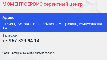 МОМЕНТ-СЕРВИС, сервисный центр по адресу 414041, Астраханская область, Астрахань, Минусинская, 8д в дальнейшем Организация, размещена в следующих категориях: