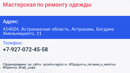 Мастерская по ремонту одежды по адресу 414024, Астраханская область, Астрахань, Богдана Хмельницкого, 11 в дальнейшем Организация, размещена в следующих категориях: