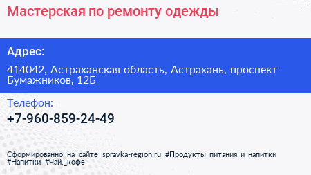Мастерская по ремонту одежды по адресу 414042, Астраханская область, Астрахань, проспект Бумажников, 12Б в дальнейшем Организация, размещена в следующих категориях:
