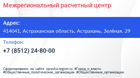 Межрегиональный расчетный центр по адресу 414041, Астраханская область, Астрахань, Зелёная, 29 в дальнейшем Организация, размещена в следующих категориях: