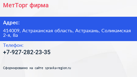МетТорг, фирма по адресу 414009, Астраханская область, Астрахань, Соликамская 2-я, 8а в дальнейшем Организация, размещена в следующих категориях: