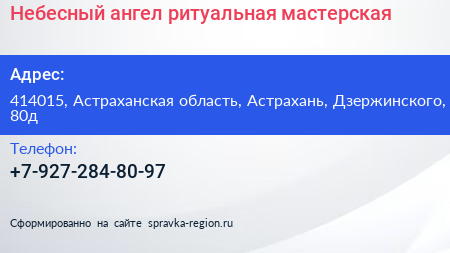 Небесный ангел, ритуальная мастерская по адресу 414015, Астраханская область, Астрахань, Дзержинского, 80д в дальнейшем Организация, размещена в следующих категориях: