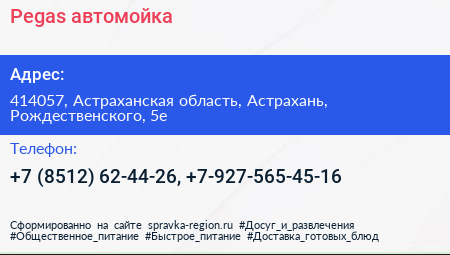Pegas, автомойка по адресу 414057, Астраханская область, Астрахань, Рождественского, 5е в дальнейшем Организация, размещена в следующих категориях: