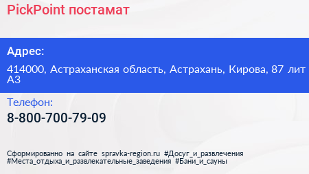 PickPoint, постамат по адресу 414000, Астраханская область, Астрахань, Кирова, 87 лит А3 в дальнейшем Организация, размещена в следующих категориях:
