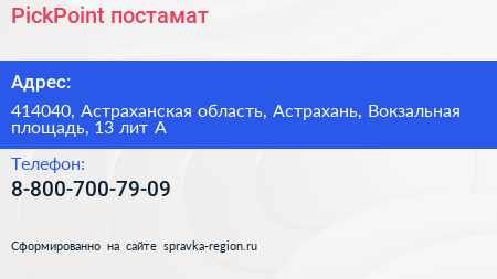 PickPoint, постамат по адресу 414040, Астраханская область, Астрахань, Вокзальная площадь, 13 лит А в дальнейшем Организация, размещена в следующих категориях: