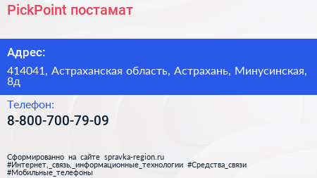 PickPoint, постамат по адресу 414041, Астраханская область, Астрахань, Минусинская, 8д в дальнейшем Организация, размещена в следующих категориях: