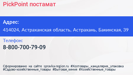 PickPoint, постамат по адресу 414024, Астраханская область, Астрахань, Бакинская, 39 в дальнейшем Организация, размещена в следующих категориях: