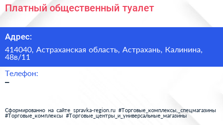 Платный общественный туалет по адресу 414040, Астраханская область, Астрахань, Калинина, 48в/11 в дальнейшем Организация, размещена в следующих категориях: