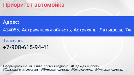 Приоритет, автомойка по адресу 414056, Астраханская область, Астрахань, Латышева, 7ж в дальнейшем Организация, размещена в следующих категориях: