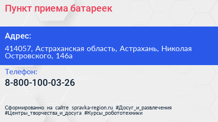 Пункт приема батареек по адресу 414057, Астраханская область, Астрахань, Николая Островского, 146а в дальнейшем Организация, размещена в следующих категориях: