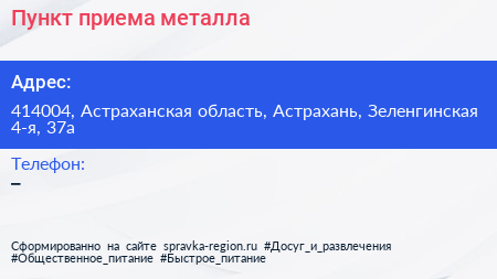Пункт приема металла по адресу 414004, Астраханская область, Астрахань, Зеленгинская 4-я, 37а в дальнейшем Организация, размещена в следующих категориях: