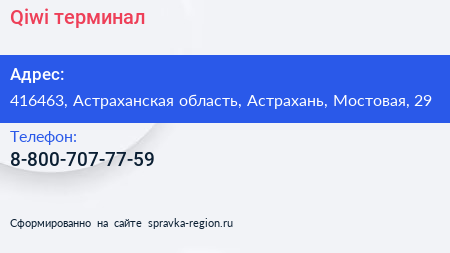 Qiwi, терминал по адресу 416463, Астраханская область, Астрахань, Мостовая, 29 в дальнейшем Организация, размещена в следующих категориях: