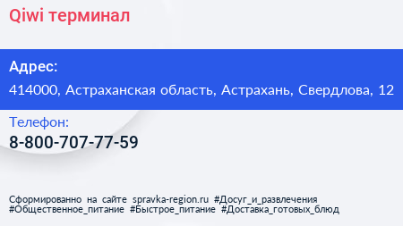 Qiwi, терминал по адресу 414000, Астраханская область, Астрахань, Свердлова, 12 в дальнейшем Организация, размещена в следующих категориях: