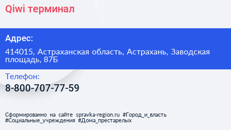 Qiwi, терминал по адресу 414015, Астраханская область, Астрахань, Заводская площадь, 87Б в дальнейшем Организация, размещена в следующих категориях: